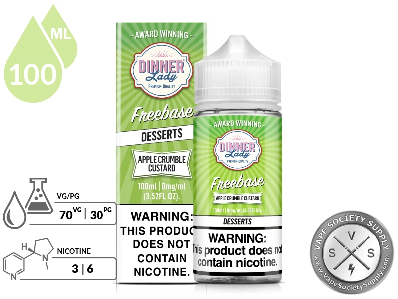 Apple Crumble Custard vape juice from DINNER LADY arrives in a large bottle while supplying the most fall, kitchen-inspired ‘bakeryness’ that really keeps you in the mood, all thanks to having a 70/30 VG/PG base.