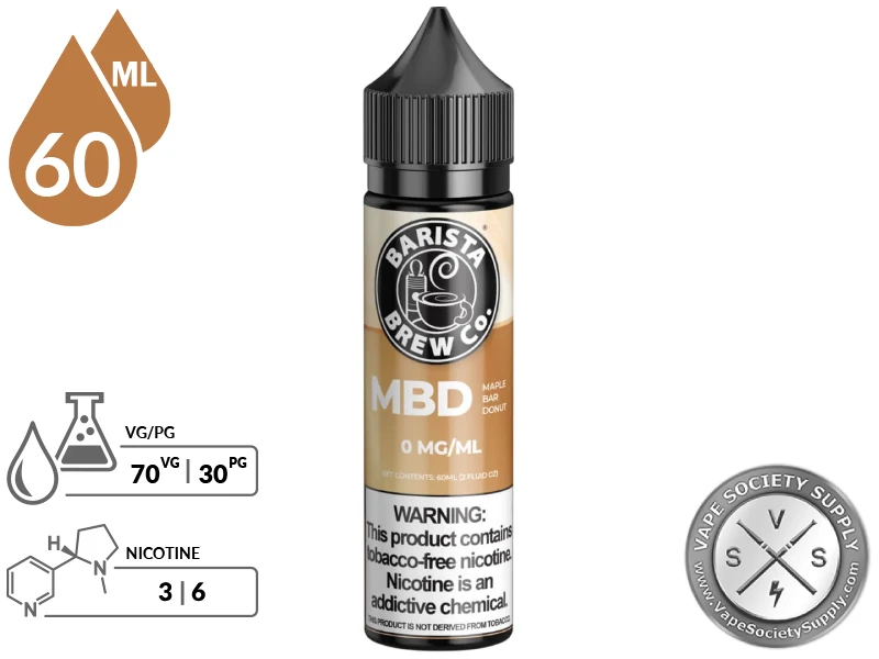 Maple Bar Donut vape juice from BARISTA BREW Co. comes in a medium-sized bottle while giving vapers some richly fantastic clouds while using their favorite box mod, due to having a 70/30 VG/PG mix.
