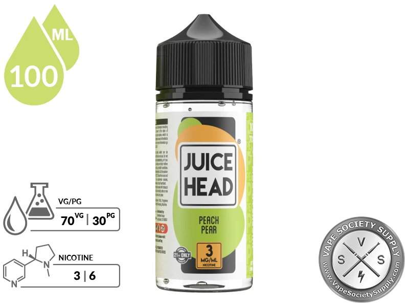 Peach Pear E-Juice from Juice Head arrives in a large bottle with a flavorful fog ratio of 70/30 VG/PG that vapers are sure to enjoy experiencing.