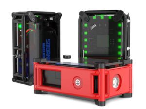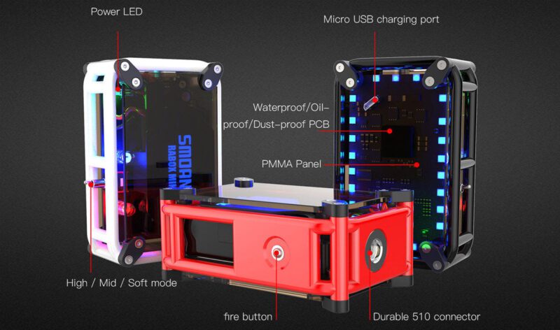 Smoant is known for creating eye-catching designs, and this device certainly fits the brand. Seven LEDs surround the outward-facing edge of the box mod, shining whatever color you set them to with the inbuilt menu. Every bit of the Rabox Mini can be customized with some work, but the device comes already set with an adjustable 3-level output mode for even easier out-of-the-box vaping.