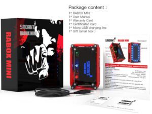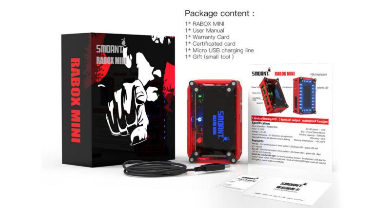 The Smoant Rabox Mini works at resistances between 0.1 ohms and 5 ohms, with a recommended best resistance of 0.3 ohms. This means that this Smoant device is perfect for sub-ohming. It can vary power between 1 and 120 watts and has intelligent voltage adjustment between 3.2-5 volts to ensure maximum flavor output from your eliquid.