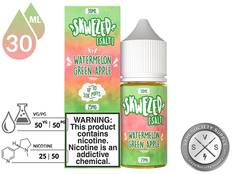 - 1 x 30ml bottle of Watermelon Green Apple SKWEZED SALT
