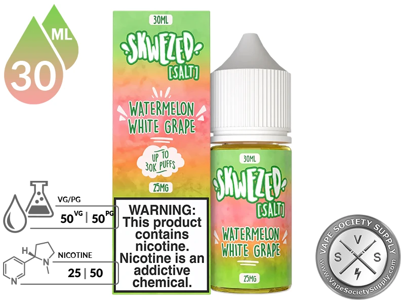 - 1 x 30ml bottle of Watermelon White Grape SKWEZED SALT